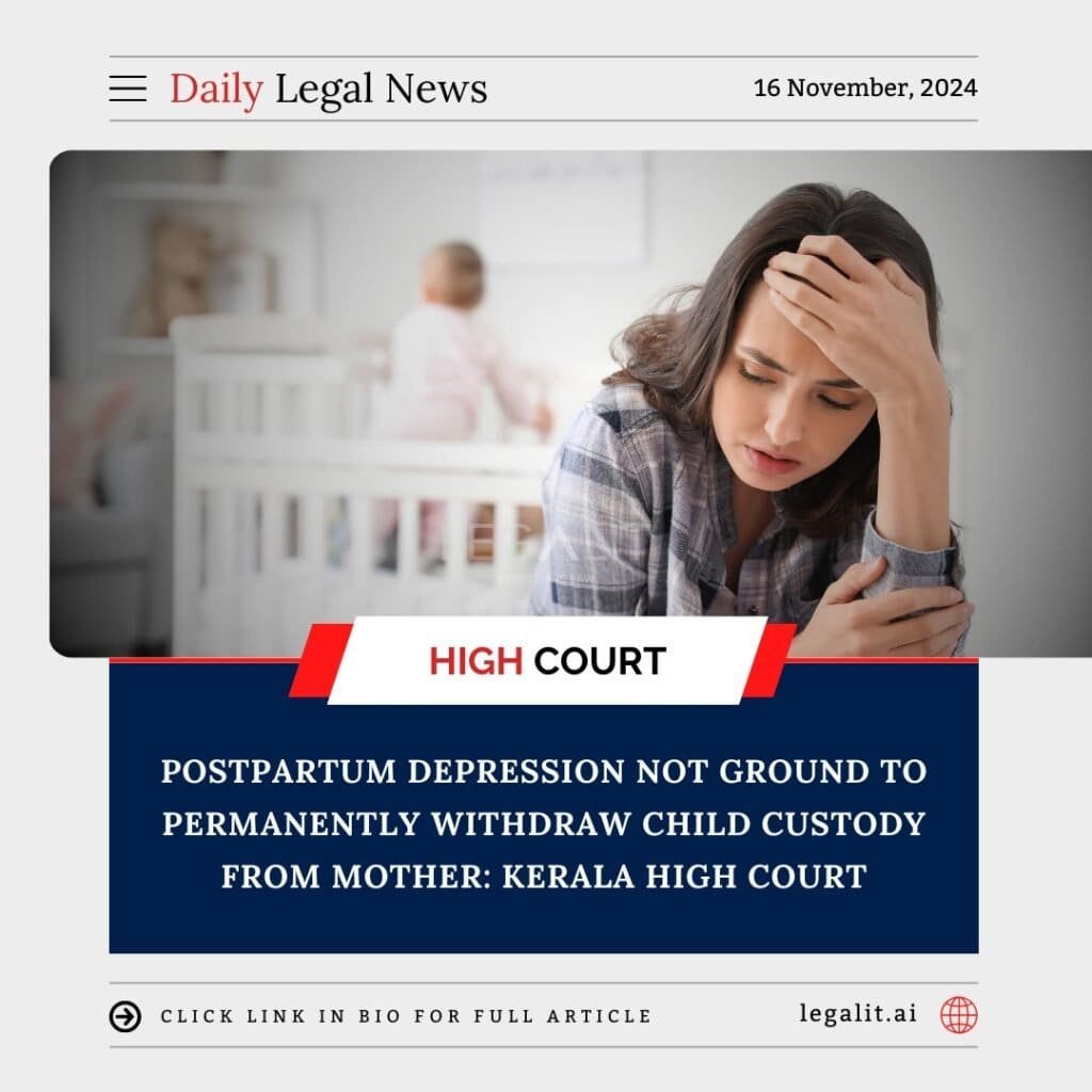 The Kerala High Court has ruled that postpartum depression cannot be a valid reason to permanently withdraw a child’s custody from the mother. The court emphasized that mental health issues, if managed and treated effectively, should not undermine a mother’s right to care for her child.
